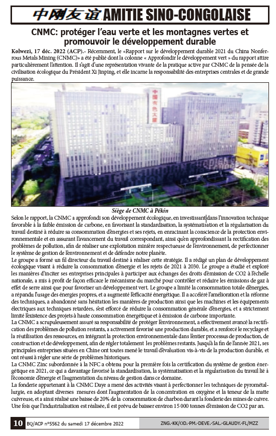 剛通社是中南部非洲最具權(quán)威主流媒體之一,創(chuàng)辦有《中剛友誼》專欄。這是在繼2021年5月五連載發(fā)布《中國有色集團(tuán)剛果(金)可持續(xù)發(fā)展報(bào)告》之后,再一次全媒體集中宣傳推介中國有色集團(tuán),形成了良好的國際輿論環(huán)境。? ? ?