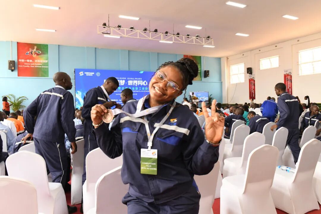 A contestant poses for a photo with her medal at the closing ceremony of the first Skills Competition for Local Employees of China Nonferrous Metal Mining (Group) Co., Ltd.'s Enterprises in Zambia, held at Sino-Zam Vocational College of Science and Technology in Luanshya, Zambia, Sept. 12, 2025 local time. (Photo/Luo Chunhui, Cheng Xiaomin)